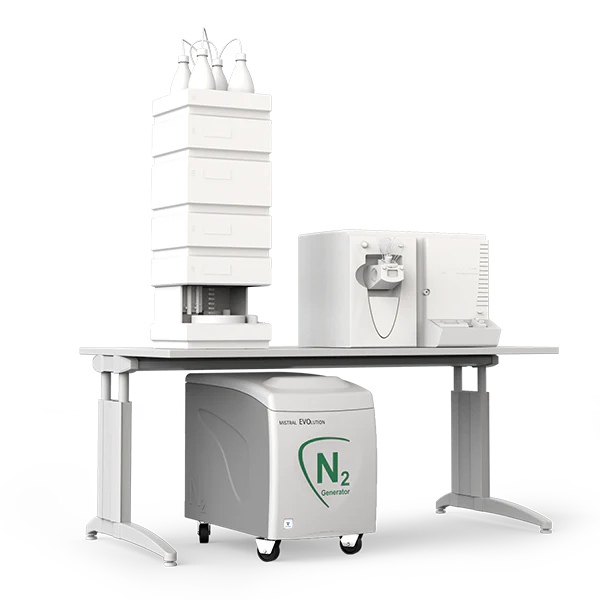 The Mistral Evolution 35 Nitrogen Generator (PSA technology), which includes an integral oil-free air compressor, delivers a continuous stream of pure nitrogen gas of 98% at a flow rate of 35 L/min. It uses the pressure swing adsorption (PSA) system that removes oxygen, carbon dioxide, and water from compressed air. The resulting stream of pure nitrogen is ideal for LCMS techniques and other inert gas applications.