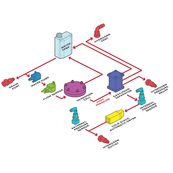 | Safety | Automatic shut down - internal/external hydrogen leak, overpressure, and low water |