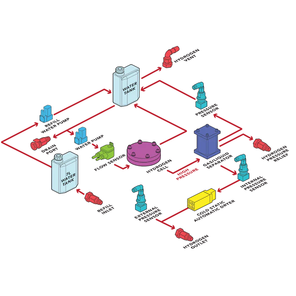 | Safety | Automatic shut down - internal/external hydrogen leak, overpressure and low water |