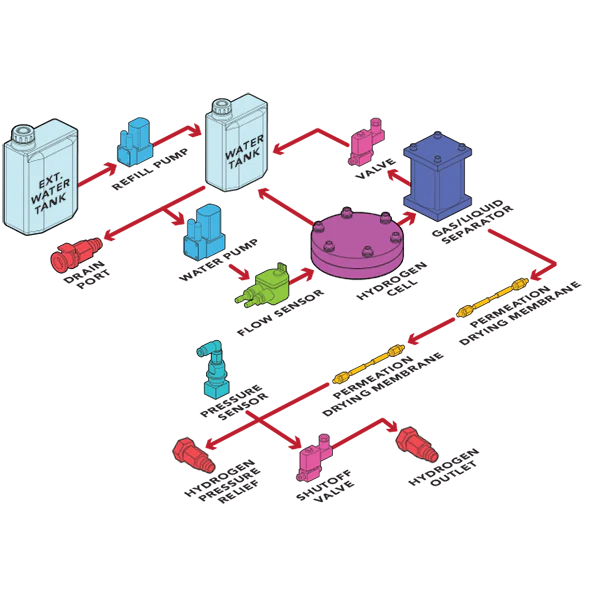 | Safety | Automatic shut down - internal/external hydrogen leak, overpressure and low water |